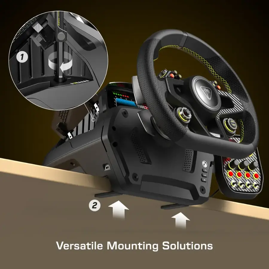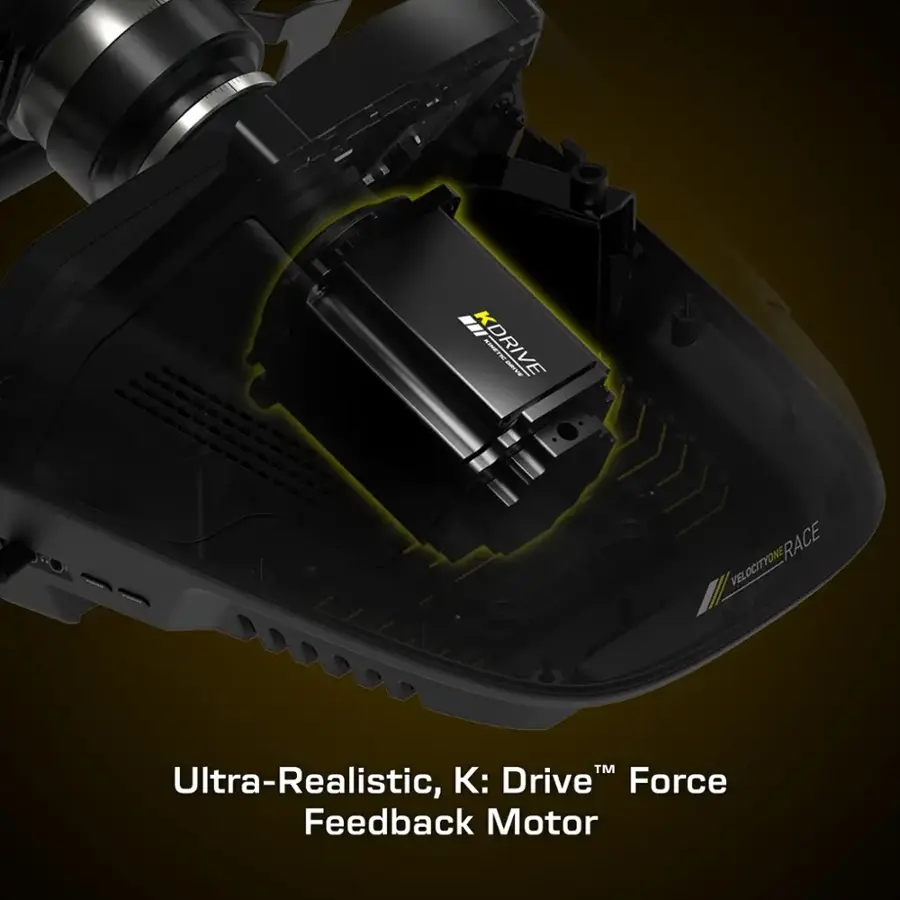 Feel every moment of a race with a custom direct-drive force feedback motor tuned for high-fidelity kinetic response.