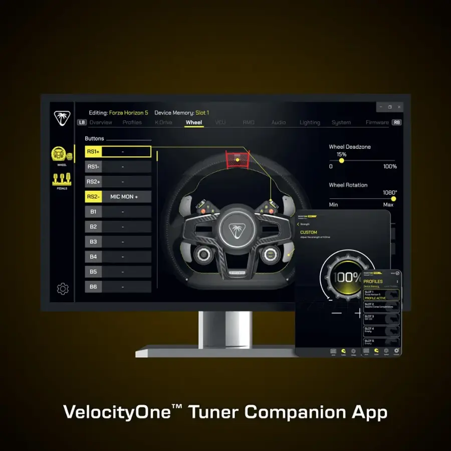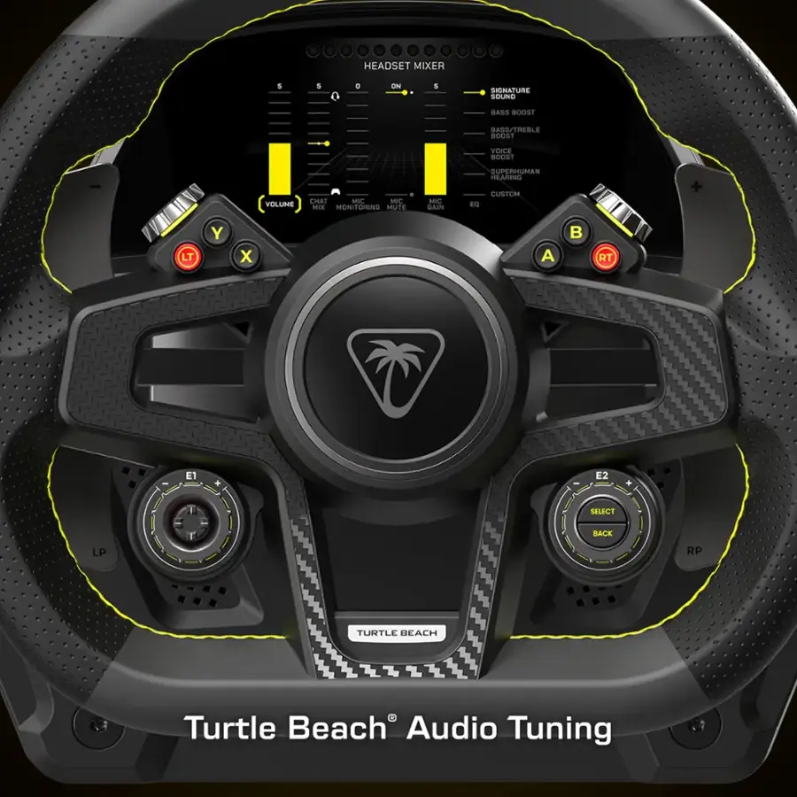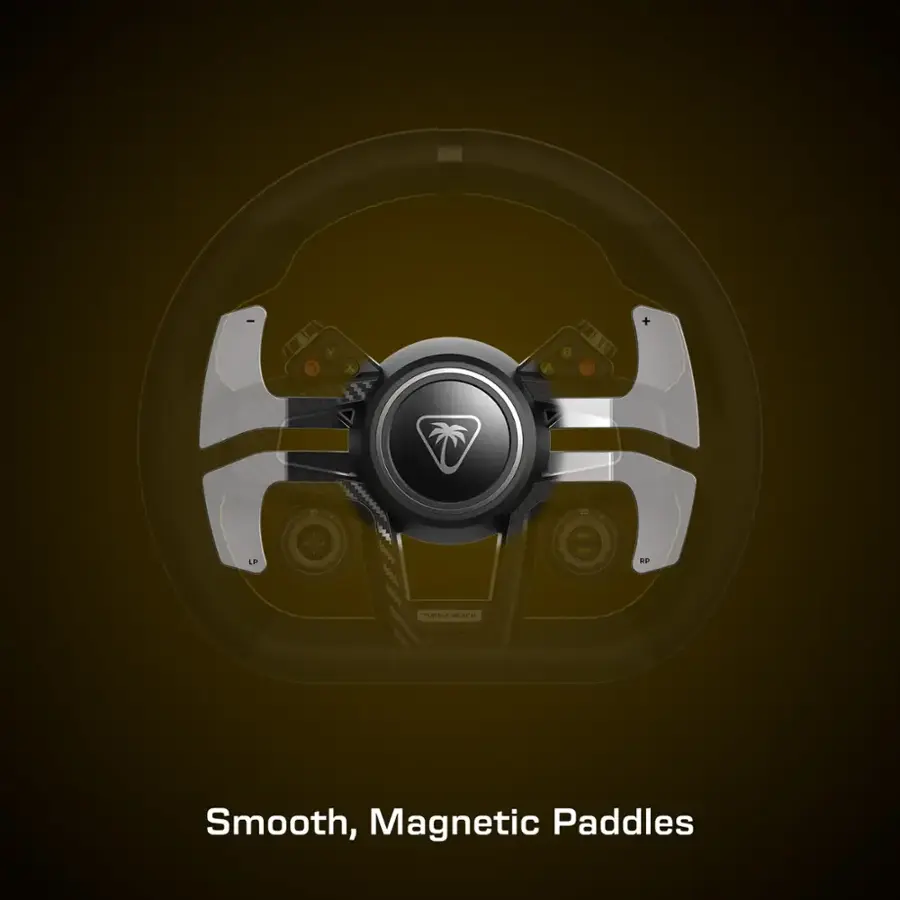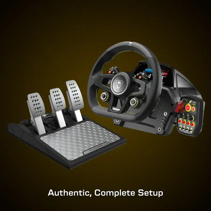 Shift into a new level of realism with the Turtle Beach VelocityOne Race Wheel & Pedal system engineered for high-fidelity racing simulation performance on Xbox Series X|S, Xbox One & Windows 10 & 11 PCs. High-fidelity direct-drive force feedback is delivered by our custom K: Drive motor. Providing powerful response while maintaining smooth steering and detailed reactions to in-race events at low latency. Fully customize your experience to suit your preferred driving environment. Plus, a hand-stitched leather wheel enhances realism and improves your grip. Bang through the gears in a classic muscle car or glide in a modern supercar with the Mag-Shift paddle shifters, offering reliable, consistent shifts every time. And for even more customization and ease of access, two additional analog paddles with magnetic hall effect sensors provide precise clutch and handbrake control.